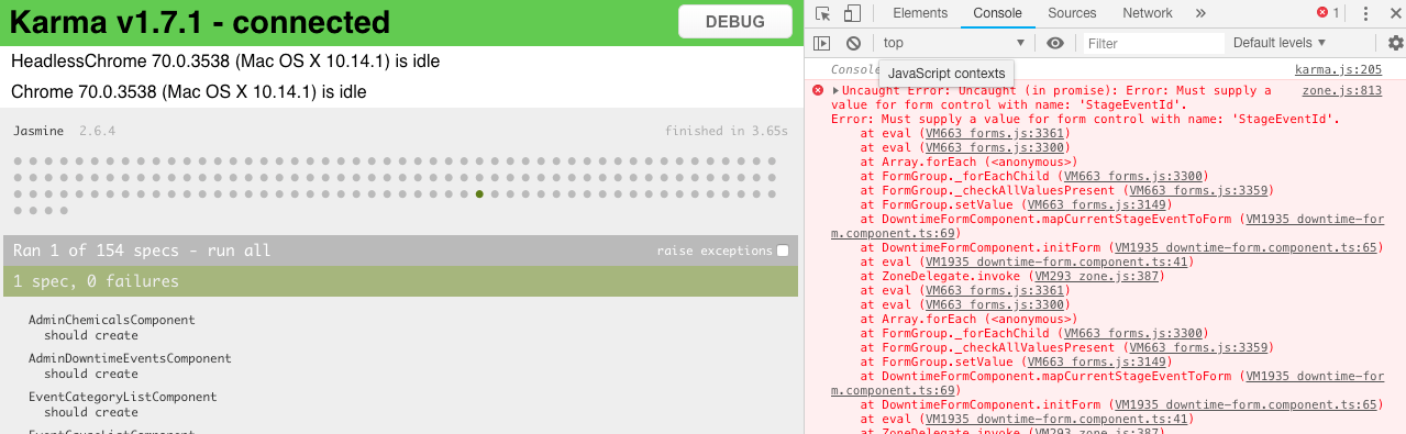 The test looks like it passes in Chrome, however the console actually shows an exception being thrown. This is that ErrorEvent object that is being reported by the other error. This also has a much better error message along with a stack trace.