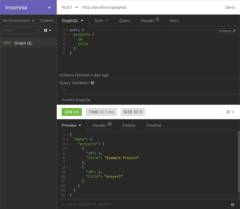 The next roadblock was how do I query this from an external app? I had originally tried to test this in Postman but eventually found the amazing Insomnia